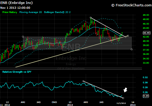 With multiple breakout signals and strong support in place, it is time to re-enter Enbridge (ENB). This has been a fantastic trend for several years and so far the recent correction has simply moved price from the top of the range down to the bottom. There is a very strong support band in place between $42 and $39 from the 8-month trading range in Mid 2012; prices have recently tested this support band, as well as the 4 1/2 year uptrend support. This anchored support zone gives us a very clear invalidation point to our entry and a low risk way to continue following this monster trend. With big trends like this, you want to be a buyer at the bottom of the channel and a seller at the top. Buy support, sell resistance. That is what we have done in the past and will look to do this time as well.